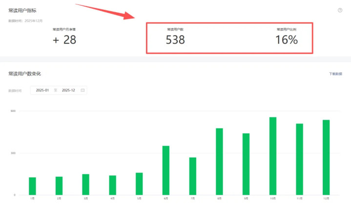 常读用户指标之前没有关注过,目前的数据是500+,占总体的16%,不知道这个比例算高还是低?