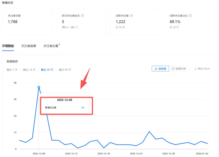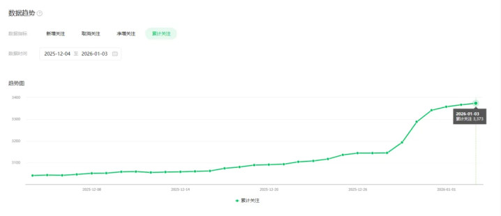 从12月5号到1月3号新增关注222人,目前累计关注1768人。