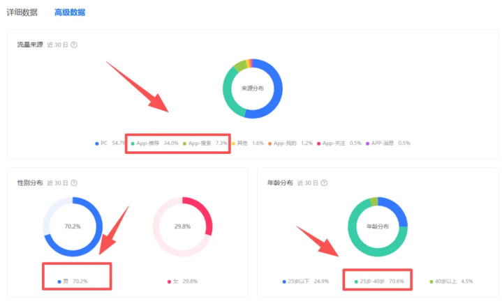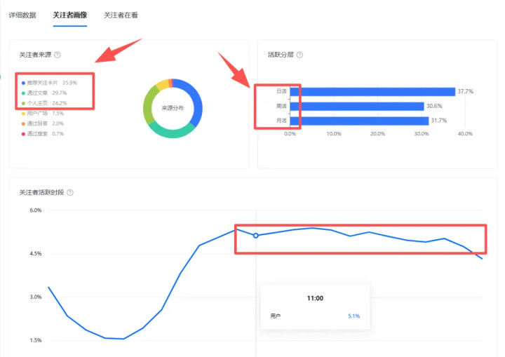 通过文章关注的占比只有3成,个人主页关注的占比24%,排名第一的是推荐关注卡片占比35%,这个应该是官方流量扶持来的吧。