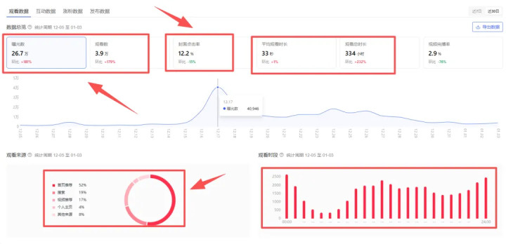 最近一个月(12-05~01-03)的累计曝光数26.7w,点击率12.2%,观看数3.9w。平均观看时长33秒,观看总时长334小时,视频完播率太低只有2.9%。