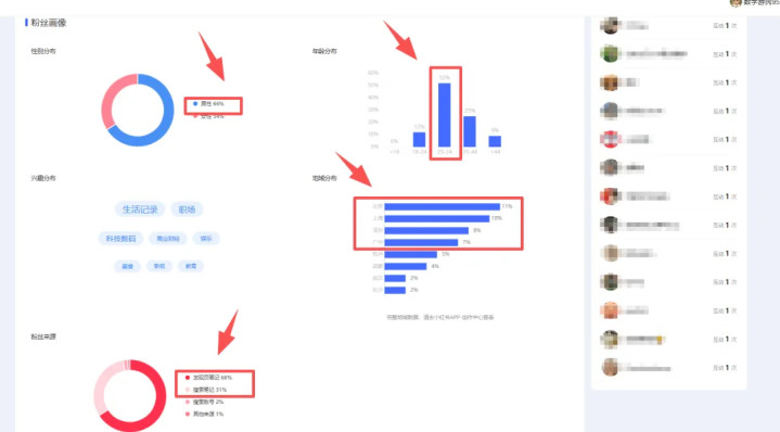 推荐笔记流量带来的关注占比66%,搜索笔记流量带来的关注占比31%,比较出乎意料的是有2%的用户(14个人)是直接搜索账号的名称「数字游民9527」关注的。