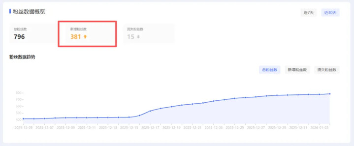 从12月5号到1月3号新增381关注,目前关注数796。春节前应该还有希望破千,再整一条爆款笔记差不多。