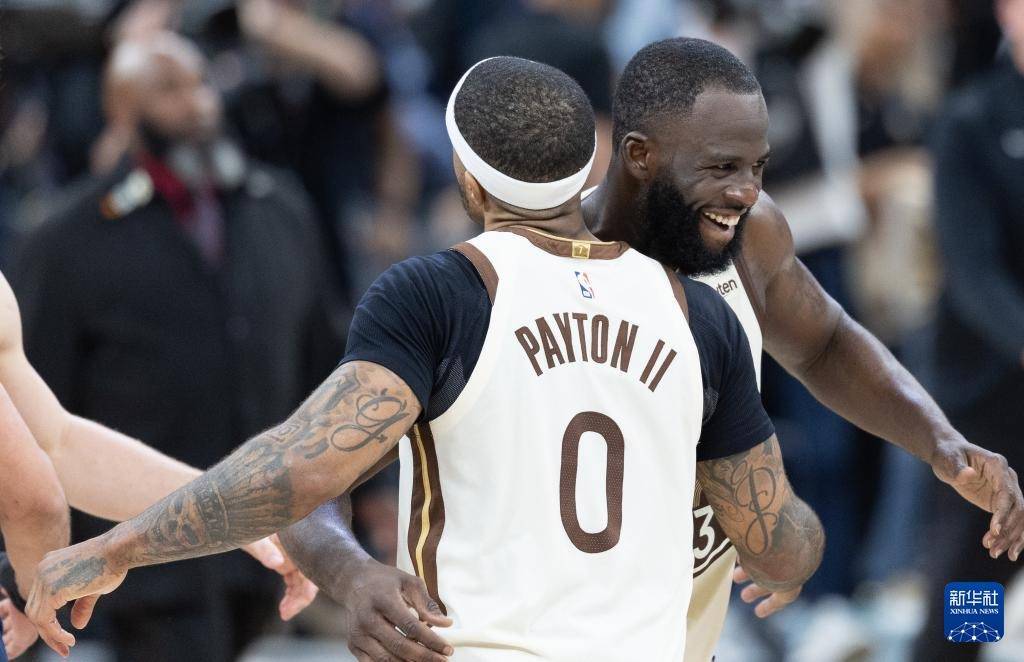 3月27日,勇士队球员格林(右)在比赛中和队友佩顿二世庆祝。